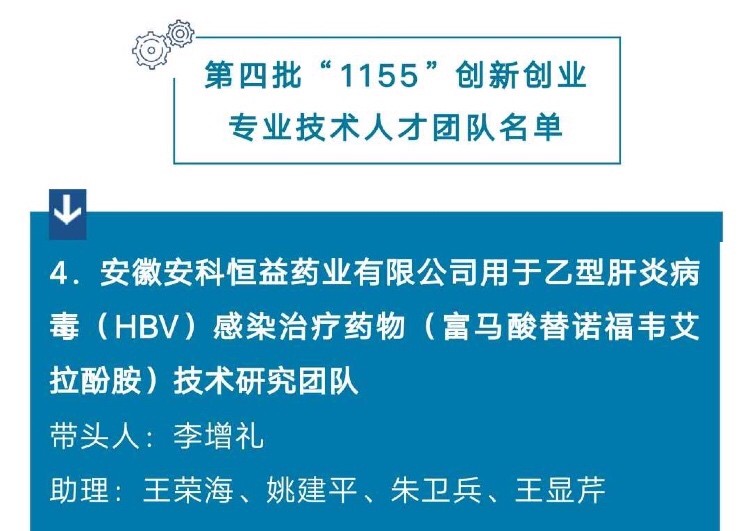 為深入推進實施新時代銅都英才計劃,經(jīng)單位推薦、部門審核、專家評審,市人才工作領(lǐng)導小組會議審定等程序,我公司的一項用于乙型肝炎病毒(HBV)感染治療藥物(富馬酸替諾福韋艾拉酚胺)技術(shù)研究團隊入選銅陵市第四批“1155”創(chuàng)新創(chuàng)業(yè)專業(yè)技術(shù)人才團隊。此次入選團隊共10個,也是安科恒益藥業(yè)公司第二次入選。